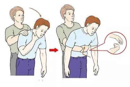 對于1歲以上的兒童,家長跪蹲在孩子的身后,雙手環(huán)抱孩子,一手握拳,虎口貼在孩子劍突下,肚臍之上的腹部中央位置,另外一手握住該手手腕,然后突然用力收緊雙臂,使握拳的虎口向患者腹部內(nèi)上方猛烈回收。該方法使用膈肌上升的力量擠壓肺及支氣管,從而將異物從氣管內(nèi)沖出。如果異物沒有沖出,家長要立即放松手臂,然后重復(fù)該動作,直到異物被排出。如圖所示